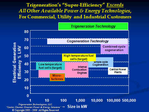 At about 86% to 93% net system efficiency, our trigeneration power plants are about 300% more efficient at providing energy than your current electric utility. That's because the typical electric utility's power plants are only about 33% efficient - they waste 2/3 of the fuel in generating electricity in the enormous amount of waste heat energy that they exhaust through their smokestacks.